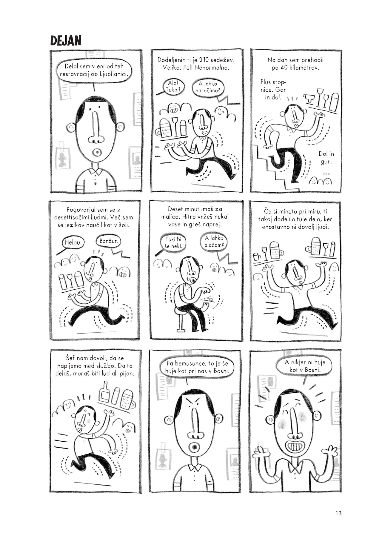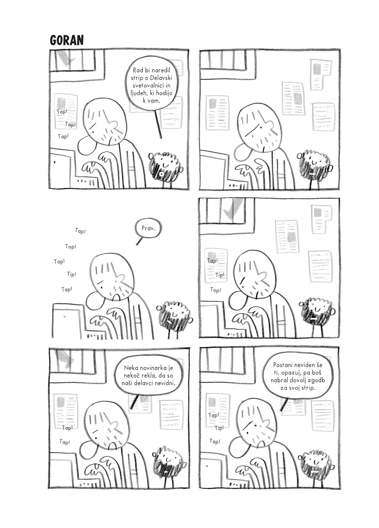 To je strip o Delavski svetovalnici. Natančneje: to je strip o delavcih, ki so se obrnili na Delavsko svetovalnico. Nekaj časa sem bil njihov prostovoljec in zanje opravljal razne drobne opravke. Takrat sem se odločil, da bom njihove zgodbe zbral in narisal. V Delavski svetovalnici sem jim to povedal in dali so mi kot, kamor sem se lahko usedel. Tedne in mesece sem tam sedel in poslušal množice delavcev, ki so hodile k njim. Zgodbe, ki so jih povedali, lahko preberete v tej knjigi.