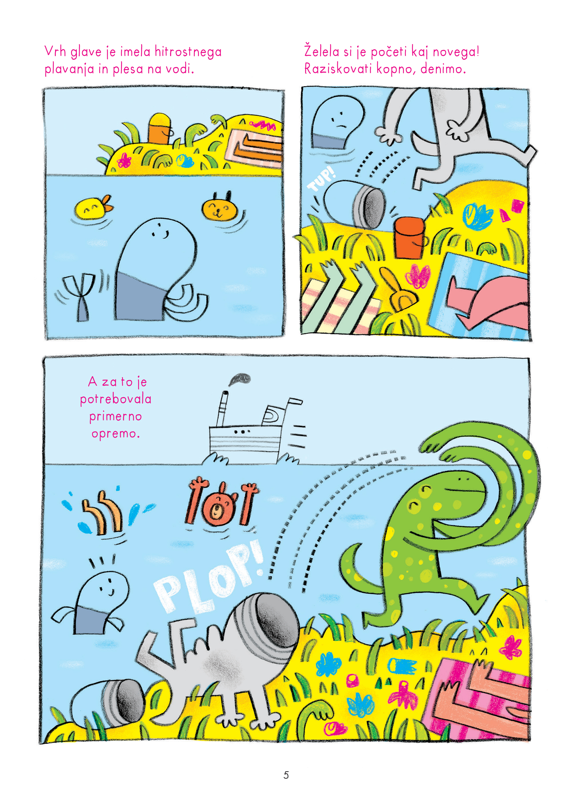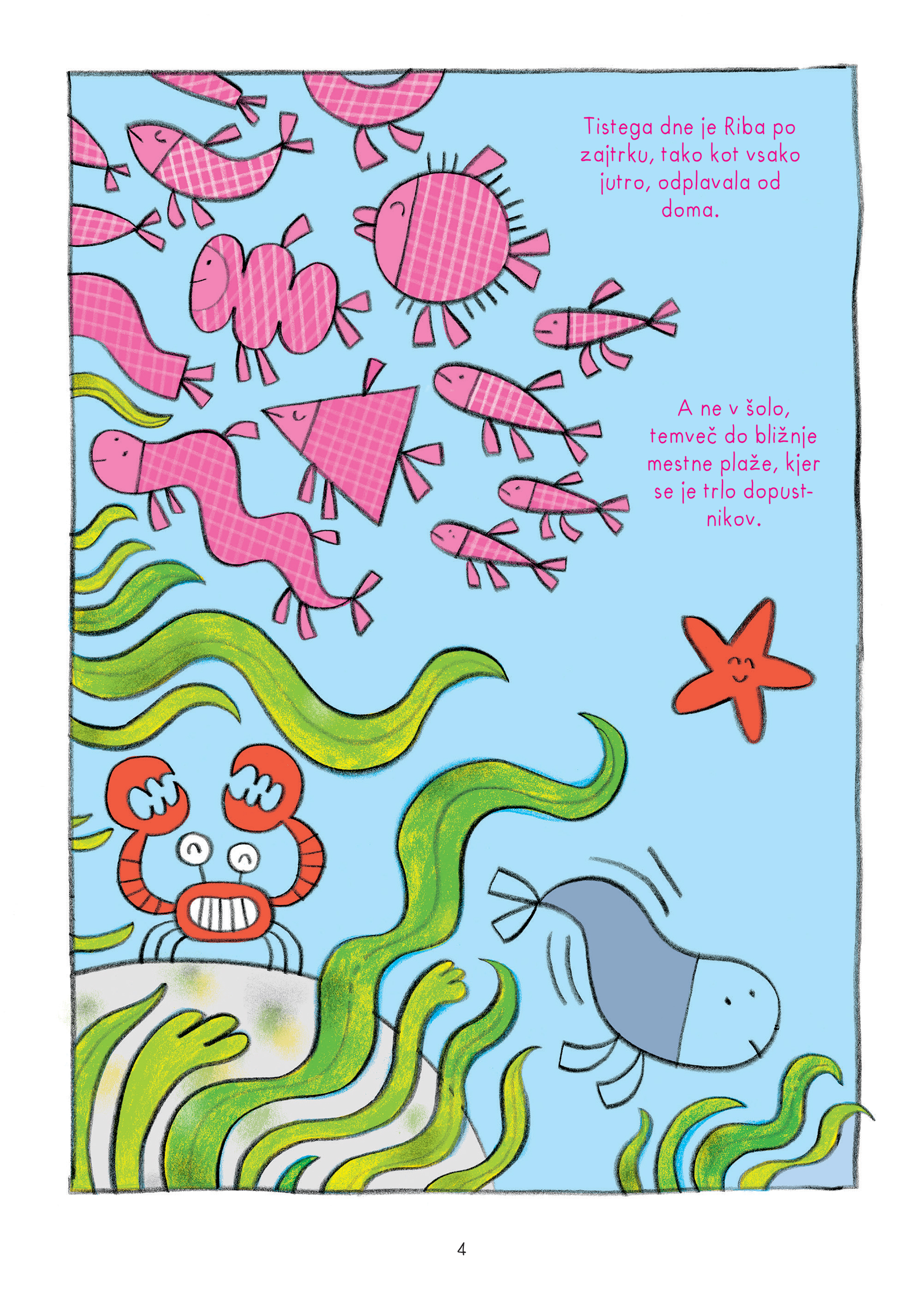 Riba se nekega jutra odloči, da noče trenirati niti plesa na vodi niti hitrostnega plavanja, ampak želi postati raziskovalka. Zato si sposodi skafander in po repu pogumno odkoraka na kopno. Tam spozna Govnača, ki ni le smetar, ampak tudi kipar, Miško, ki je uradnica, a na skrivaj piše pesmi, Kameleona, ki ima velikansko zbirko slik, ter podjetnega Žabca in pikro Bogomolko. V njihovi družbi raziskuje mesto in najde prijatelje.