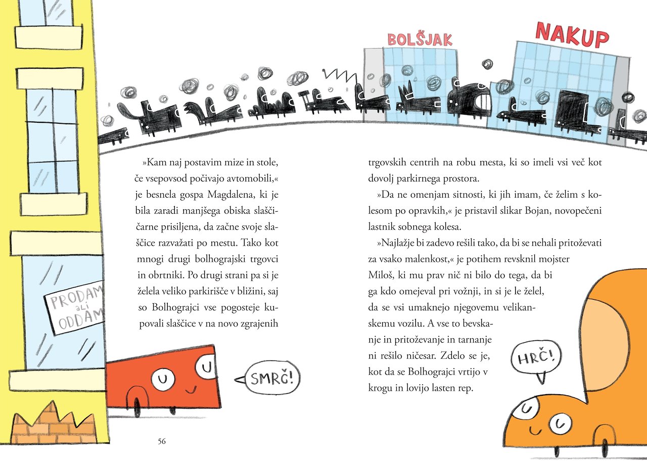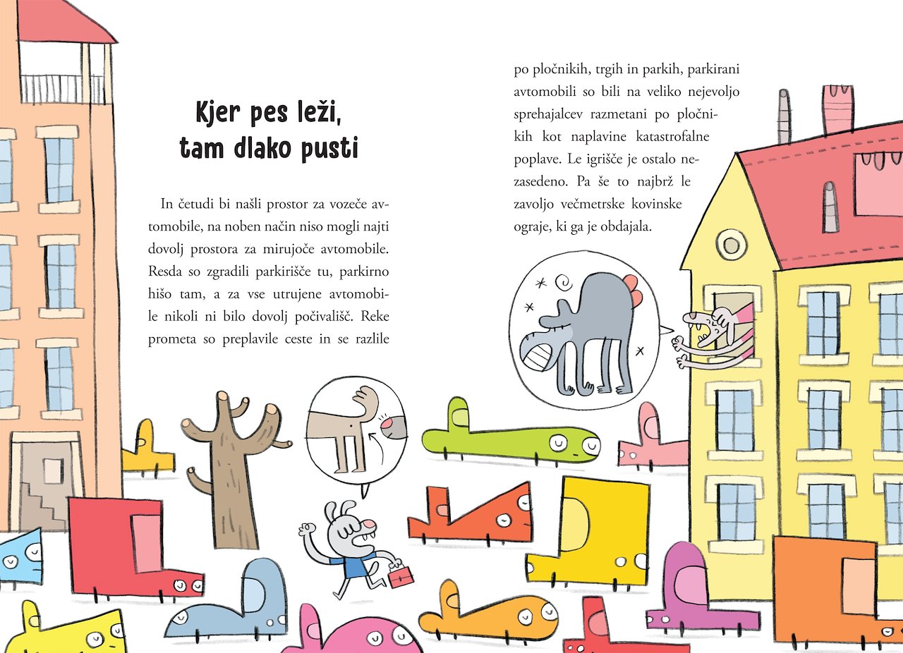 V Bolhogradu so glavni psi. No, pravzaprav sčasoma glavni postanejo avtomobili. Ceste so kmalu premajhne za ves promet. Meščani se praskajo za ušesi in iščejo rešitev, ki jo najdejo v širših cestah in večjih parkiriščih. Ampak kaj, ko je avtomobilov vedno več, poprej zadovoljni meščani pa zaradi prometnih zamaškov in drugih tegob iz dneva v dan postajajo vedno bolj nejevoljni. Pa se spet praskajo za ušesi, kako bi zadevo rešili …